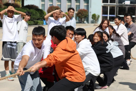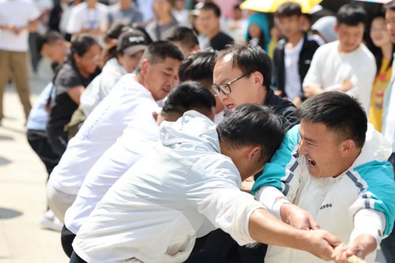 比赛过程中,各参赛队员运用技巧,铆足了劲、涨红了脸,紧抓绳子全力以赴。一旁观看的教师组成“临时啦啦队”,为参赛队员加油助威。加油声、欢呼声此起彼伏,现场欢腾热闹。