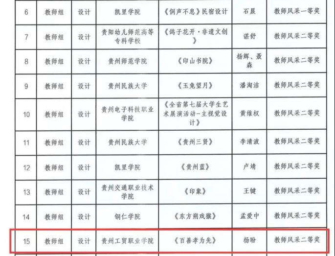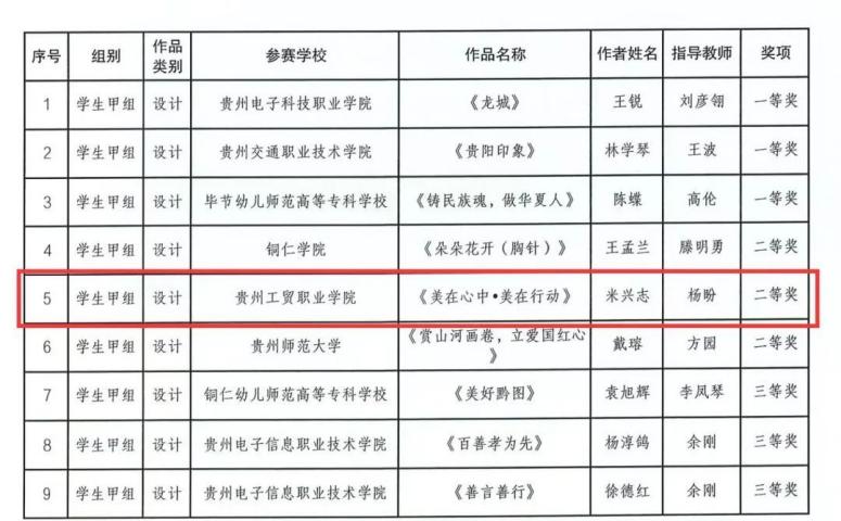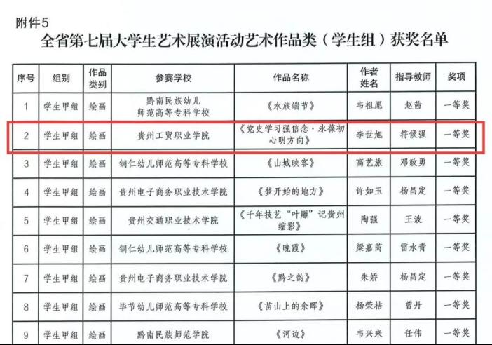 近日,贵州省教育厅关于公布全省第七届大学生艺术展演活动暨全省首届“美的教育”高校师生书画设计作品展中评选结果的通知,Ky开元取得优异的成绩,荣获一等奖、二等奖、三等奖的荣誉。
