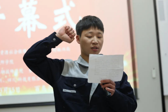 参赛选手代表陈平代表参赛选手宣誓。他表示,将以严肃认真的态度,勇于拼搏的精神,严谨求实的作风参加此次比赛,我们将自觉服从大赛安排,严格遵守赛场纪律和规则。在比赛过程中赛出水平、赛出风格、赛出成绩,用我们的双手传承和发扬技工学子的精神,为职教事业的发展贡献自己的力量!