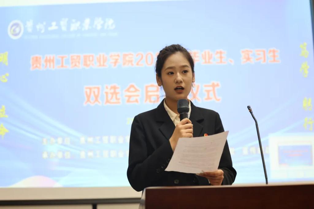 2024届毕业生代表王煊宁作为毕业生代表发言。她表示,双选会不仅为学生们提供了一个了解行业动态和企业需求的平台,更开启了职业生涯的新篇章。通过与企业的面对面交流,同学们不仅获得了实习和就业的机会,还收获了宝贵的面试经验和职业建议。