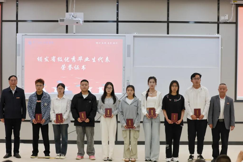 校党委副书记、校长李建萍,校党委委员、副校长李新发为获得省级“优秀毕业生”荣誉称号的毕业生代表颁发证书。