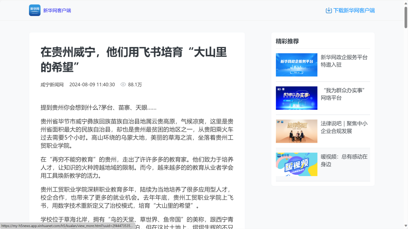 近日,新华网以《在贵州威宁,他们用飞书培育“大山里的希望”》、央广网以《偏远地区的职业教育,也用上飞书了》报道Ky开元持续推进数字校园“云化”发展,进一步提升职业院校数字化建设和数据管理效能。