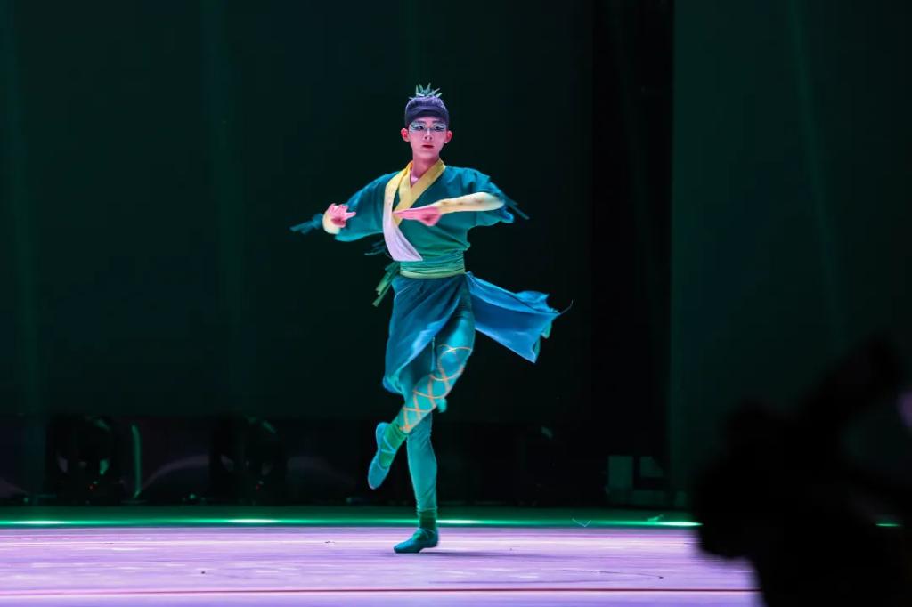 男子独舞《竹梦》以竹为核心意象,舞者通过精湛的技艺展现竹子的各种姿态与神韵。从新生竹笋的蓬勃生机到风中翠竹的摇曳多姿,刚柔并济地展现古典舞的魅力和竹子所蕴含的坚韧不拔、高风亮节等高尚品质。这一节目不仅是艺术的展示,更引导观众思考思政教育元素,激励学生在面对困难时要像竹子一样坚韧,培养高尚的道德情操。
