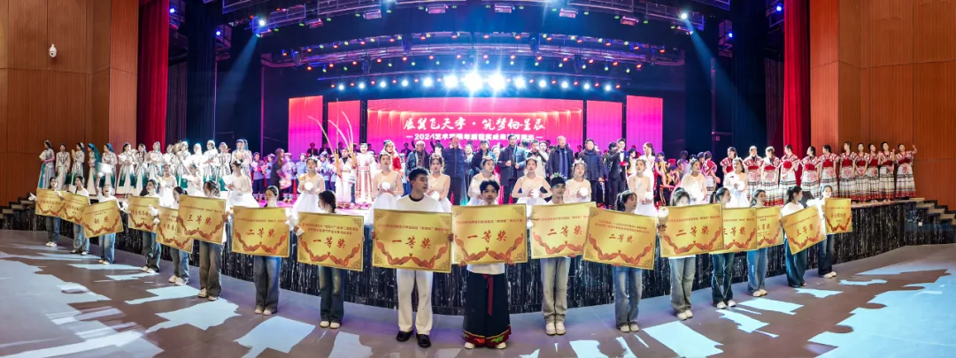 本次晚会亮点纷呈,所展演的节目,例如:苗族芦笙队获贵州关岭2024“四月八”暨第二届国家级非物质文化遗产芦笙大赛传统项目一等奖;群舞《一个都不能少》《彝酒魂》获2024年“职教杯”舞蹈大赛一等奖;《天路》获2024贵州省“职教杯”合唱比赛二等奖;《夜郎故里我的家》获2024贵州省“职教杯”合唱比赛二等奖……2024年度,Ky开元集团艺术学院在全国、全省各类专业赛事及项目中获得各类大奖近20项。一件件精心雕琢、匠心独运的作品,频频斩获省内外艺术领域的重要奖项,赢得了广泛的认可与赞誉。这一系列作品不仅展现了艺术学院师生超凡脱俗的技艺,更以其精美绝伦的舞姿、深刻的文化内涵,让人赞叹不已,为现场师生带来一场别有生面的视听盛宴。