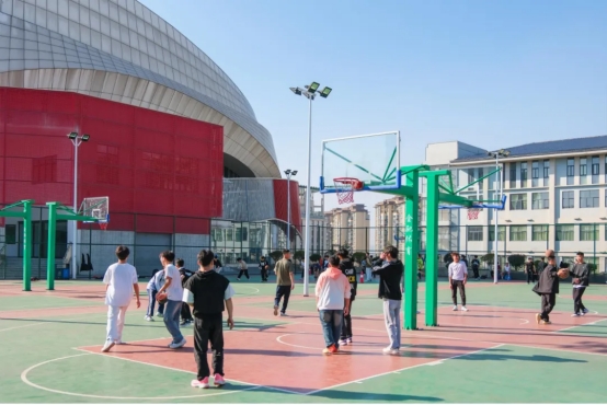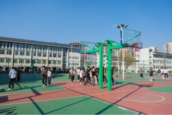学校拥有4个篮球场,举办“迎新杯”看球赛、教职工篮球赛等。