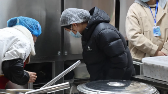 检查小组来到食堂,在进入食堂后厨前,按照要求进行了必要的卫生措施如戴口罩、头罩等,并与食堂工作人员进行了面对面的交流,提出了对饭菜价格、质量、服务的意见和建议。