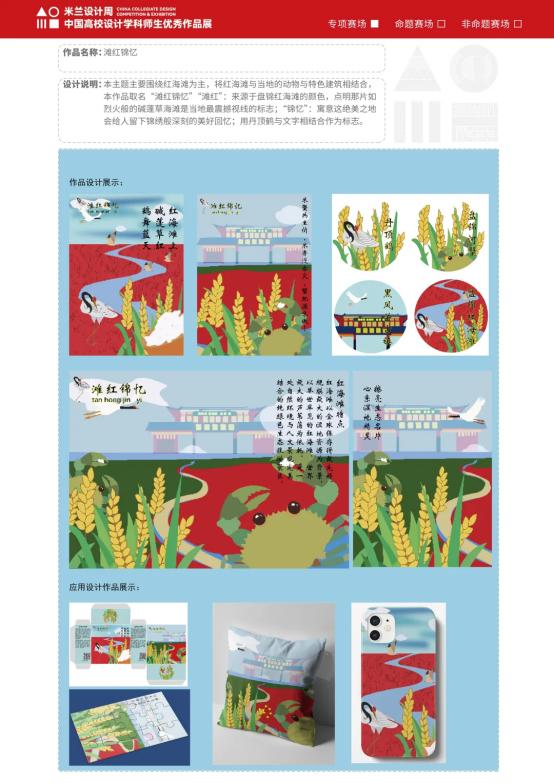 艺术学院学生屈梦露同学创作的作品《滩红锦忆》(作品ID:341379)摘得国家级三等奖。该作品由黄克松、文晨两位教师联合指导,在聚焦地域文旅融合的“盘锦礼物”设计大赛中,《滩红锦忆》以盘锦市独特的红海滩、芦苇湿地等生态符号为核心创意,通过艺术化提炼与创新设计手法,将自然景观与人文记忆转化为兼具审美价值与市场潜力的文旅产品。