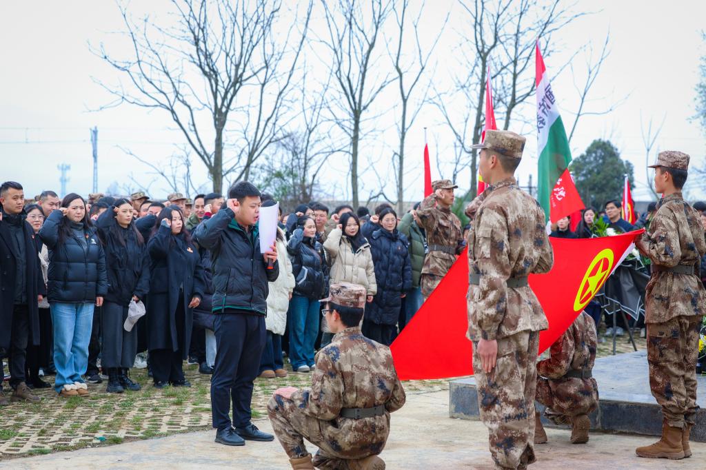 江燕虎带领全体团员重温入团誓词。在鲜艳的团旗下,团员们举起右手,庄严宣誓,誓言铿锵有力,响彻陵园。通过重温入团誓词,进一步坚定团员的理想信念,增强青年学子的责任感和使命感。