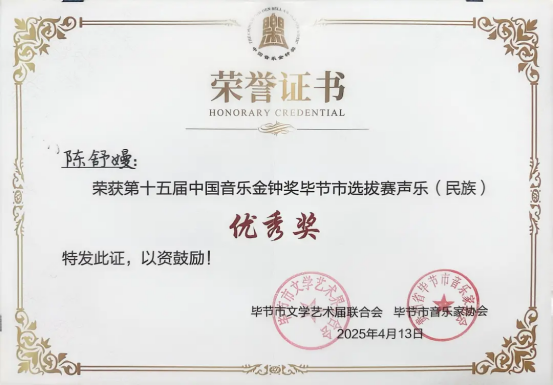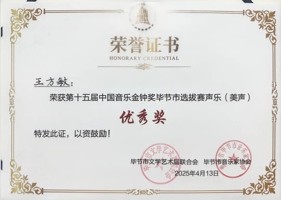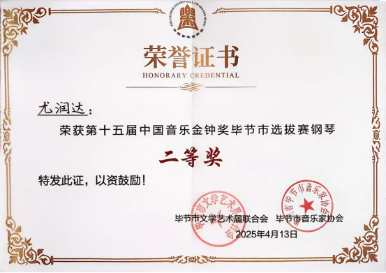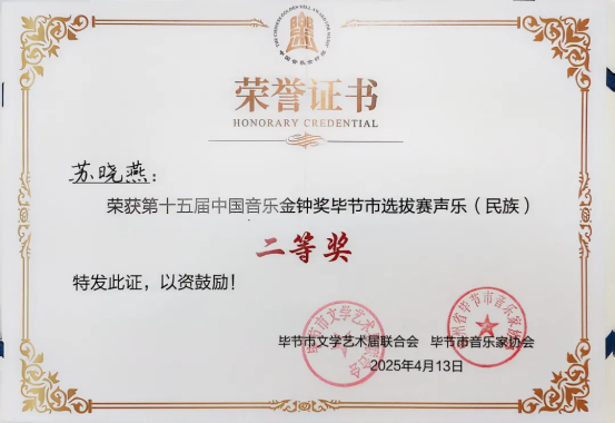 经权威评审团严格评选,尤润达老师获得钢琴组二等奖(第二名),苏晓燕老师获得声乐(民族组)二等奖,两位教师同时获组委会推荐,代表毕节市参加省级金钟奖比赛。王方敏、陈舒嫚两位教师分获声乐(美声组)、声乐(民族组)优秀奖。