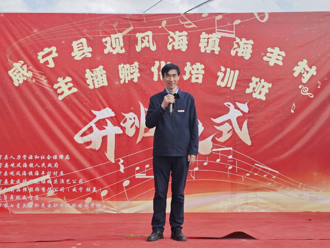 4月22日下午,应校企合作单位威宁县观风海镇政府邀请,学校常务副校长勒系琳、现代商务学院党支部书记张凤玉、老师黄瑶参加了威宁县观风海镇海丰村主播孵化培训班开班仪式。出席开班仪式的还有威宁县县委宣传部副部长马勋勇,观风海镇副镇长田庆菊、海丰村支部第一书记马洪全、海丰村支部党支部书记赵俊松等。当地电视直播行业的主播50余人参加培训开班仪式。威宁县委宣传部副部长马勋勇讲话后。
