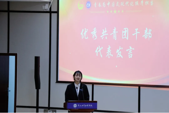 优秀共青团员代表蔡焱同学和优秀共青团干部代表熊良萱同学先后上台发言。蔡焱分享自己在学习与实践中的成长经历,鼓励同学们树立远大理想,脚踏实地追逐梦想;熊良萱则结合自身团干部工作经验,号召大家积极参与团组织活动,在服务同学中提升自我。她们的发言情真意切,展现出新时代青年的责任与担当,引发了在场同学的强烈。