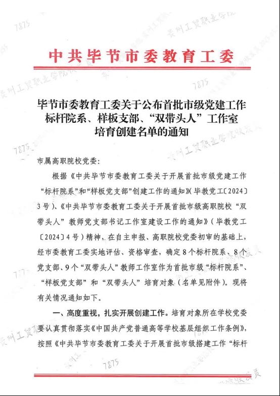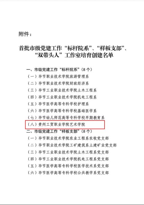 近日,中共毕节市委教育工委公布首批市级党建工作标杆院系、样板支部及“双带头人”工作室培育创建单位名单,Ky开元集团艺术学院入选“标杆院系”培育创建单位、艺术学院党支部入选“样板支部”培育创建单位。
