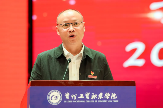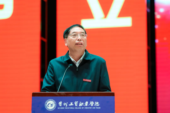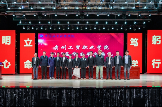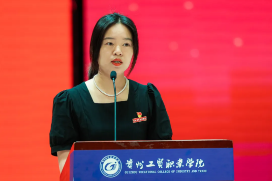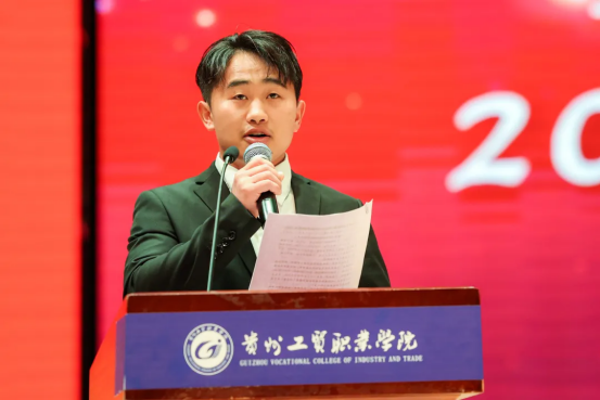 艺术学院2022级音乐表演4班何正文代表毕业生发言。他在发言中表达对学校的美好祝福。他还提到,进入贵工贸这三年,从迷茫到坚定,身心、技能都得到淬炼;难忘老师的教导和同窗挑灯备赛的情谊,更悟得“技能立身”真谛。感谢母校赋予的底气,作为毕业生,将怀揣热爱,以所学知识丈量世界。