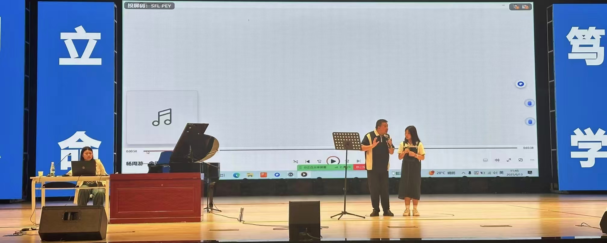 在讲解歌手嗓音类型与演唱风格形态时,杨嵩不仅详细解析了理论知识,更即兴示范了多种唱法转换技巧,其专业的演绎引得现场掌声不断。他还重点讲解了演唱前的意识基础、心态调试和基础准备工作,强调“演唱不仅是技术的展现,更是情感的表达”这一重要理念。讲座中,杨嵩特别强调了歌曲作品的选择与翻唱方法,并分享了流行声乐演唱的26项关键技术诀窍,内容详实且富有启发性。此外,他还介绍了流行练声速成法,并通过现场发声练习与歌唱教学环节,与师生展开深度互动。在实践教学环节,三位音乐表演专业的学生在杨教授的指导下进行了现场演唱示范,杨嵩从气息控制到情感表达都给予了细致点拨和专业指导,赢得了阵阵掌声。