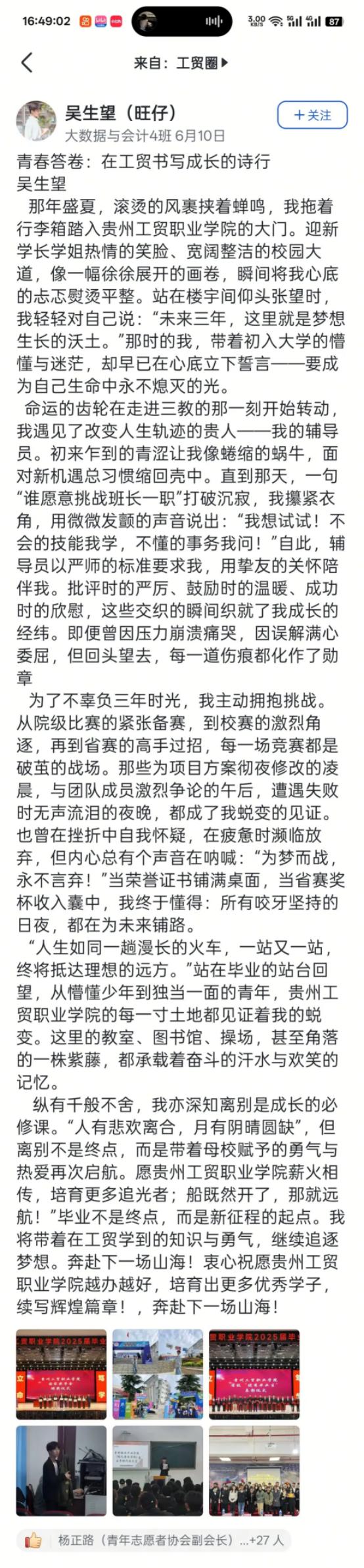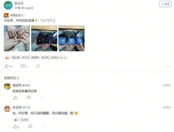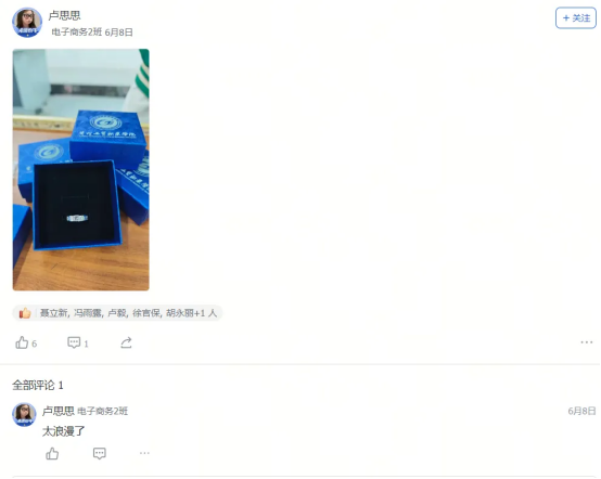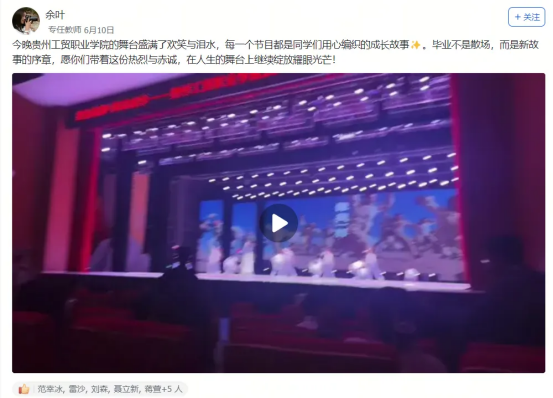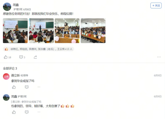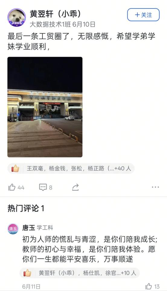 艺术设计1班的迟同学在毕业晚会后飞书工贸圈的深情致谢,大数据技术1班的黄同学发出的“最后一条工贸圈,无限感慨,祝学弟学妹们学业顺利!”及其评论区里唐玉老师“初为人师的慌乱与青涩,是你们陪我成长”的动情回应……这一条条动态,一声声祝福,一幅幅定格在飞书工贸圈里的鲜活画面与肺腑之言,早已超越了简单的社交分享。它们无声地串联起散落天涯的思念,凝聚成贵工贸这个大家庭最温暖、最坚韧的情感纽带。在这个注定要各自远航的夏天,工贸圈成为盛放离愁别绪、传递无尽祝福的云端港湾,让“Ky开元集团永远是你们的家”这句承诺,有了触手可及的温度与回响。
