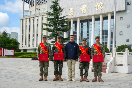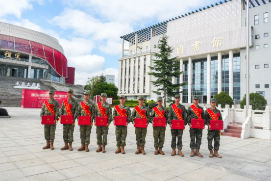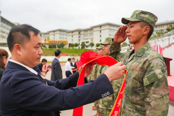 新兵欢送环节。校领导为即将奔赴军营的新兵们佩戴上光荣的大红花。这一刻,光荣与梦想交织,责任与使命同行,现场响起经久不息的热烈掌声,这是对学子们携笔从戎、保家卫国选择的最崇高敬意。