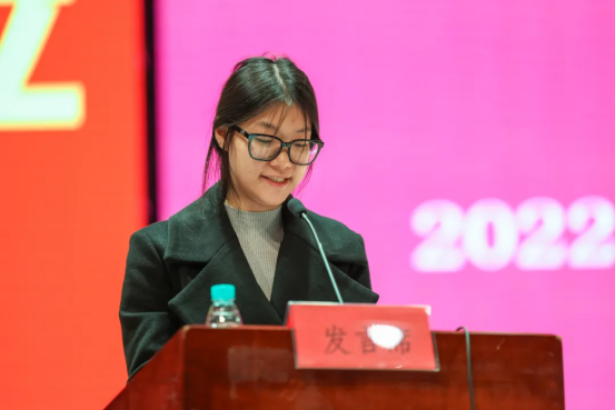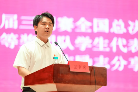 获奖学生代表陈熙作励志分享。他回忆大一时的迷茫,到后来通过脚踏实地努力,团队取得了包括三创赛特等奖在内的百余项荣誉。他说,每一份荣耀的背后,都浸染着不为外人道的艰辛与执着,是无数个与星辰为伴、与长夜共舞的坚守。他鼓励学弟学妹要相信努力终有回报,珍惜学校搭建的广阔平台,用奋斗书写青春。