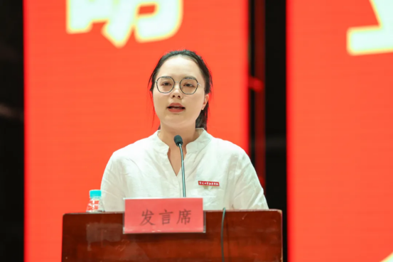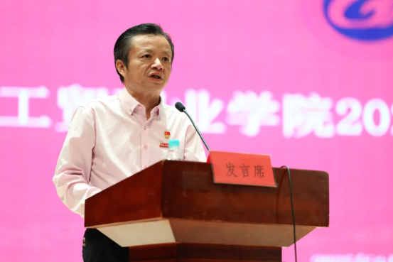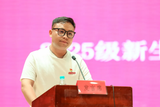 辅导员代表蔡帛轩用三个关键词寄语新生。他强调“目标”是大学征程的指南针,要求新生深入理解校训精神,明确发展方向;“坚持”是破解成长难题的关键钥匙,希望新生在面对困难时能够持之以恒;“温度”是要守护集体的归属感,在集体中体悟青春的赤诚和浪漫。他承诺全体辅导员将成为学生最坚实的后盾,以亦师亦友的身份陪伴学生度过青春三年。