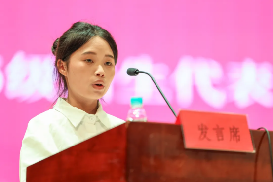 新生代表和小春同学作发言。她回忆起报到当日老师和学长学姐们不顾炎炎烈日接送新生的感人场景,表示深切体会到学校的温暖与关怀。她分享了自己的三年规划:第一年夯实基础,建立关系;第二年勇于突破,挑战自我;第三年紧盯目标,脚踏实地。她表示要树立远大目标,推动知识与品格共同提升。
