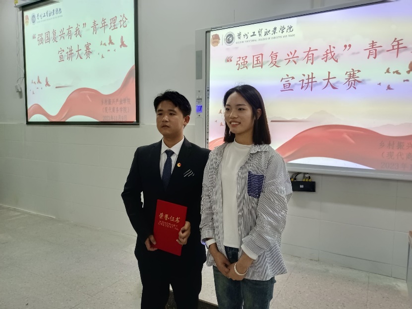 为深入学习贯彻习近平新时代中国特色社会主义思想和党的二十大精神,落实“强国复兴有我”主题宣传,引导广大青年学生自觉把思想和行动统一到党的二十大精神上来,大力营造凝心聚力、团结奋斗的浓厚社会氛围。11月9日晚上,乡村振兴产业学院(现代商务学院)于三号教学楼第二阶梯教室举办了“强国复兴有我”主题宣讲比赛。本次评委由乡村振兴产业学院(现代商务学院)团总支书记袁优、团学科员夏婷老师及辅导员欧阳云雪老师担任。活动由2023级高速铁路客运服务(1)班赵柏添同学主持。