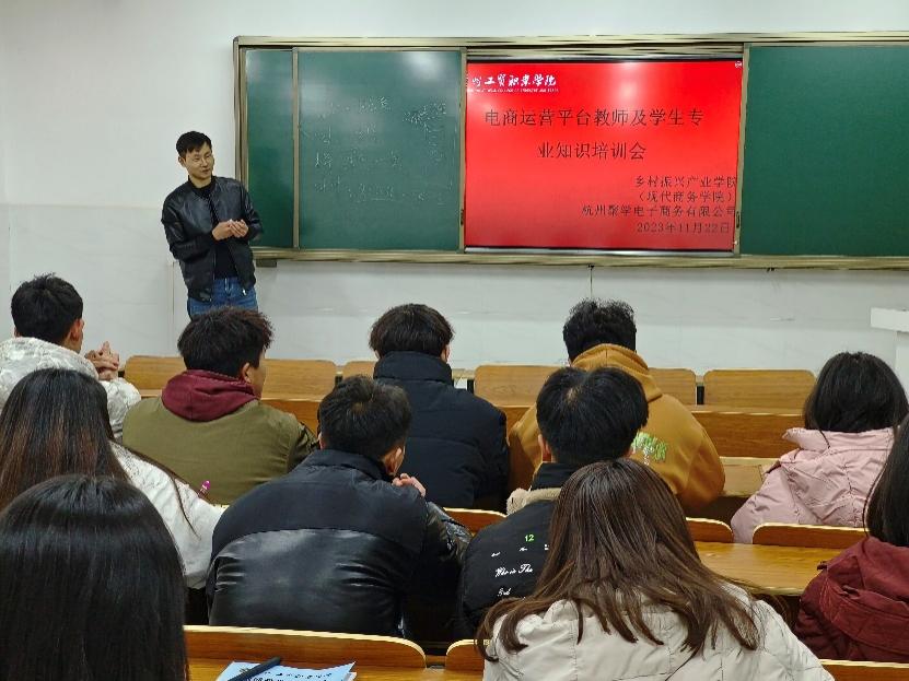 11月22日上午,乡村振兴产业学院(现代商务学院)校企合作企业——杭州聚学电子商务有限公司为我院电子商务专业师生开展专业知识能力培训交流会。鉴于近期我院电子商务专业学生在产教融合试运行实训中的一些问题,为进一步提高专业教师技能,加强师生的管理与写作,促进学生专业能力的提升,掌握学生的实训实践需求,杭州聚学电子商务有限公司王奕钢总经理与师生进行了培训交流,电子商务专业全体教师、杨一梅常务副院长、企业其他管理人员及22、23级班级学生实训运营组长参与此次培训。