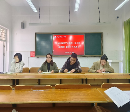 为保障期末各项工作规范、严谨、有序开展,同时抓好考务工作的组织协调,进一步严肃考风考纪,引导全院教师提高认识、严肃认真开展期末工作,乡村振兴产业学院(现代商务学院)12月15日在三教东区307召开期末工作专题会。学院常务副院长杨一梅、教务科科长彭小璇、学工科科长吴国凡、团总支书记袁优分别就相关工作做详细安排。会议由杨一梅主持,全院教职工参加。