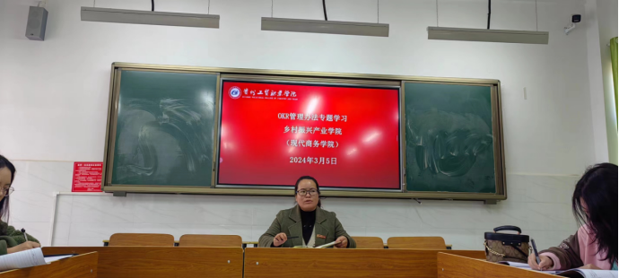 本次专题会议由乡村振兴产业学院(现代商务学院)常务副院长杨一梅领学,她围绕OKR的基本说明,如何制定“O”和“KR”,OKR制定的基本原则,OKR制定过程中的要求和注意事项,以及实施中的关键点等方面进行详细的解读,并针对重要内容进行了举例说明。杨一梅提醒老师们,要把学习运用OKR作为本学期及今后的一项重要任务,学好用好工具,推动学院建设发展,提升自身教育教学能力水平,为学校升本共同努力。最后,杨一梅以自己制定的OKR为例,指引学院全体教职工再继续深入学习《办法》后,根据上一级的OKR尽快制定出个人详细有效的OKR,助推学院各项工作快速发展。