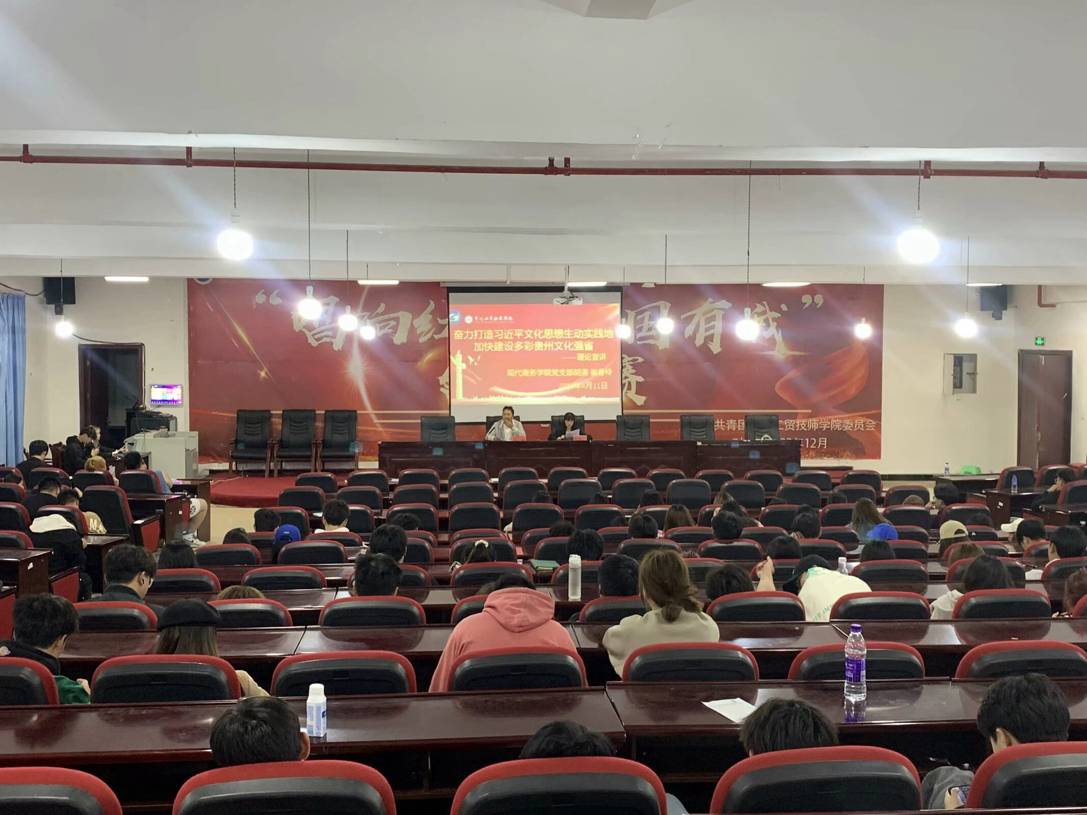 为深入学习贯彻习近平新时代中国特色社会主义思想,增强我院师生对多彩贵州文化强省建设重要性的认识。4月11日晚,现代商务学院党支部在草海大讲堂开展了“奋力打造习近平文化思想生动实践地,加快建设多彩贵州文化强省”的专题理论宣讲二人讲活动,由支部组织委员崔香伶和党员胡潇两位同志主讲,现代商务学院全体党员、学生会、各班团支书及学生代表参加了此次活动。