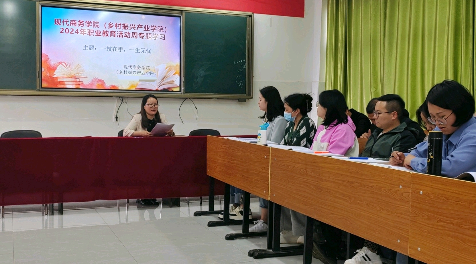 职业教育前途广阔,大有可为。随着国家的政策调整和对职教的重视关注,今天的职业教育更是硕果累累、魅力四射。自2015年起,国务院就将每年5月的第二周规定为“职业教育活动周,以此为契机,不断开创职业教育新局面,塑造新的赛道。围绕“一技在手·一生无忧”的活动主题,现代商务学院(乡村振兴产业学院)开展了形式多样的职教周活动,旨在深入贯彻落党的二十大精神和习近平总书记关于职业教育的重要指示批示精神,致力于形成全院、全校、全社会关心支持职业教育的良好氛围,凝聚职业教育“前途广阔、大有可为”的社会共识,展示职业教育改革发展成果,从而增强职业教育适应性和吸引力。我院本周活动安排涵盖了全院专题学习动员会议、各教研室专题研讨、职业技能展示、主题班会召开、团支部学习分享、实训基地参观等多个环节,让全院师生在多样的活动中了解职业教育、关心职业教育、研究职业教育、感受职业教育的魅力,激发全院师生在职业教育的舞台上大显身手、练就扎实的专业技能、创造优秀的职教业绩,为职教学生打好就业基础,搭建成长成才的广阔舞台。