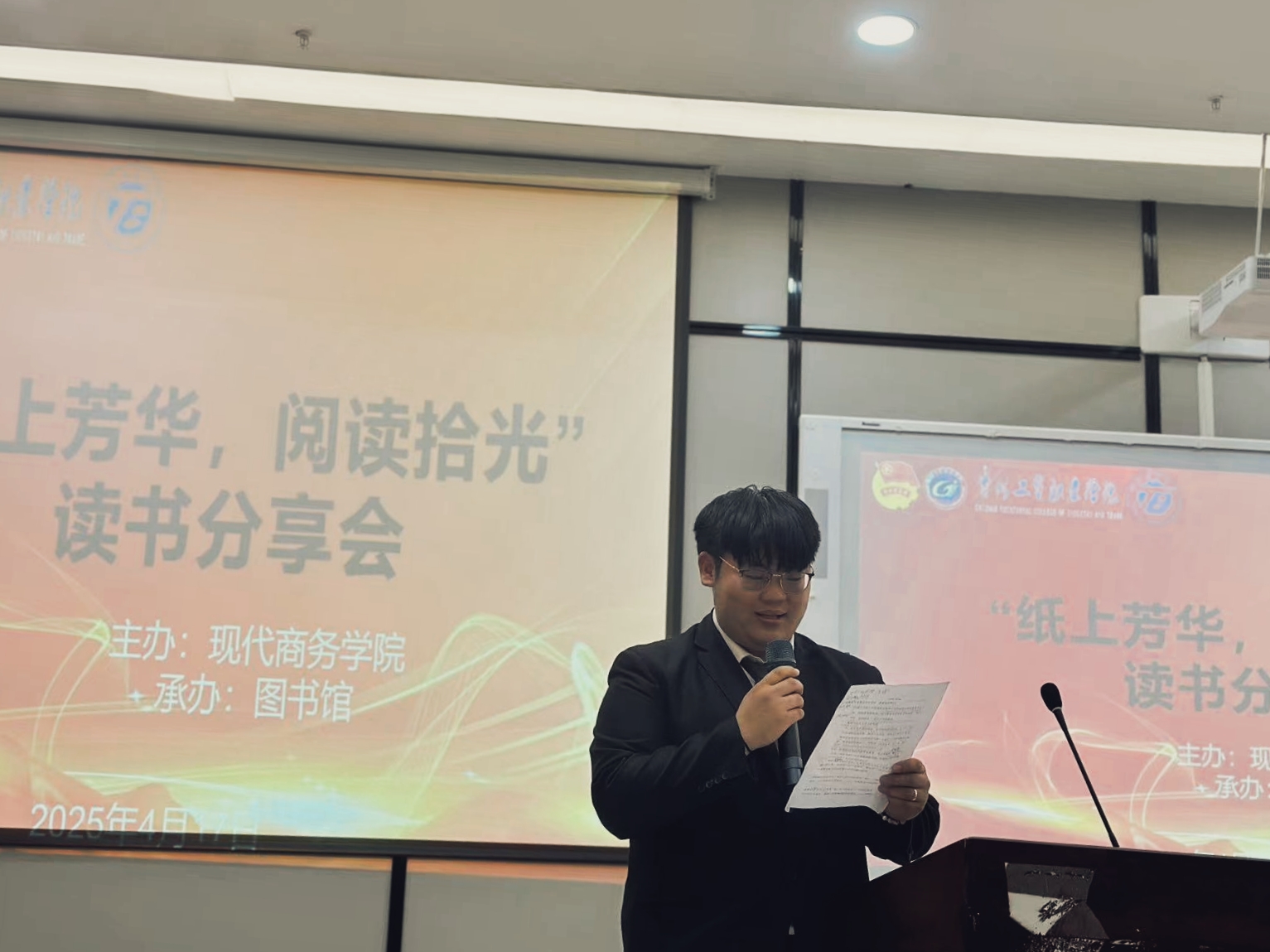 4月17日,在第30个“世界读书日”来临之际,为激发学生阅读兴趣、营造浓厚阅读氛围、促进思想交流、提升教育智慧,图书馆与现代商务学院(乡村振兴产业学院)联合举办了"纸上芳华,阅读拾光"主题读书分享会。读书分享会由现代商务学院(乡村振兴产业学院)学生会成员赵柏添同学主持。主持人首先介绍了活动背景、目的和流程。在轻松愉悦的氛围中,活动正式拉开序幕,开启了一场书香文化之旅。