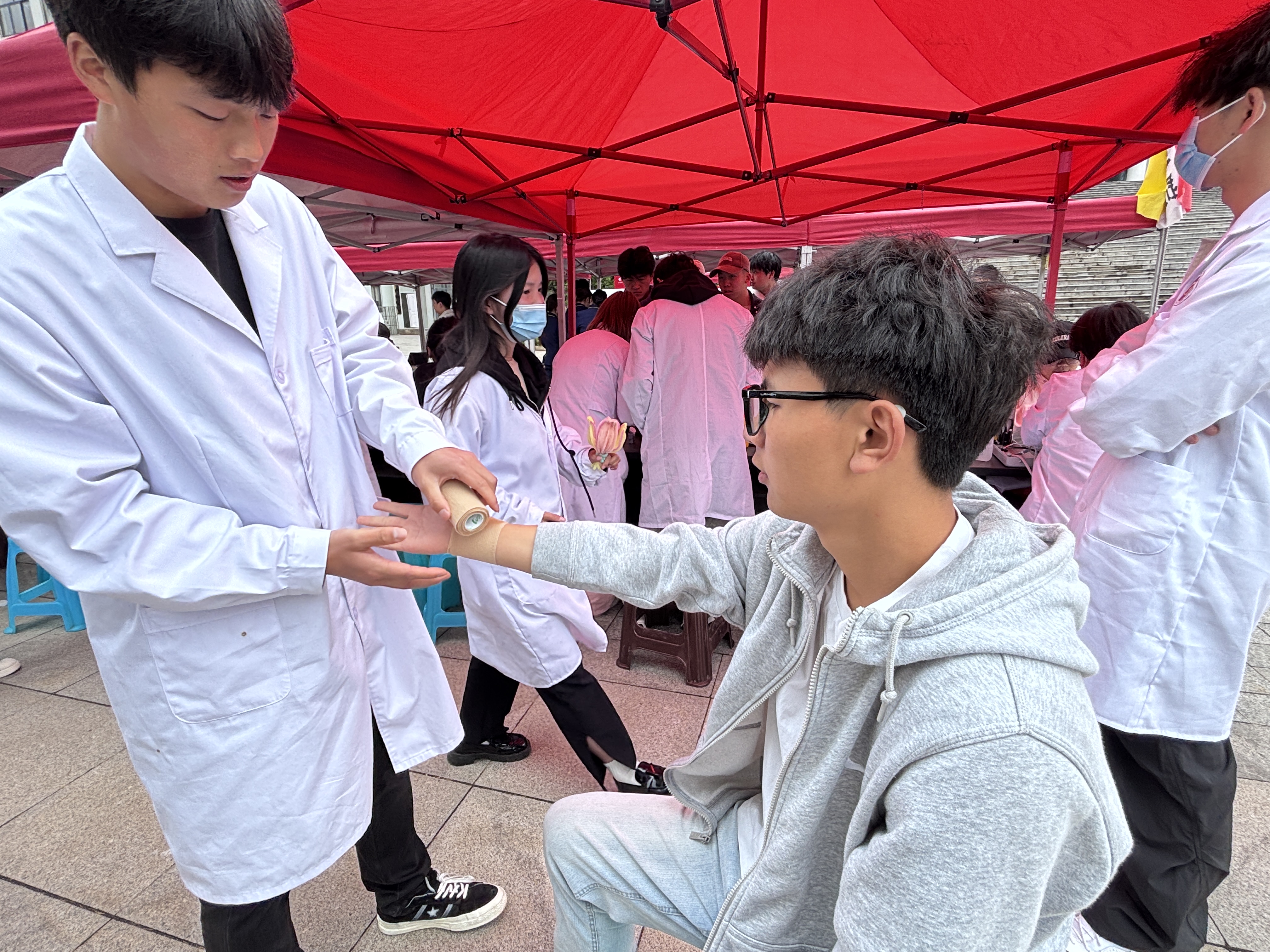 活动现场,我院师生以专业、严谨的态度,依次向全校师生展示了心肺复苏术(CPR)的规范操作流程,从判断意识、启动应急反应系统,到胸外按压、人工呼吸等关键步骤,每一个动作都精准到位,充分展现了扎实的急救技能功底;在精准测量血糖环节,学生们熟练操作血糖仪,从消毒、采血到读数,动作娴熟且细致入微,还耐心地向观众讲解血糖监测的重要意义和正常范围;血压监测展示中,学生们熟练运用血压计,正确绑扎袖带、听诊肱动脉搏动,准确记录血压数值,并针对不同血压情况给出了合理的健康建议。