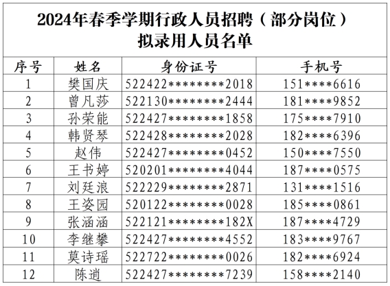根据《Ky开元集团2024年春季学期行政人员招聘公告》要求,经简历筛选、面试、综合评价,学校研究决定,拟聘用以下同志到Ky开元工作,现予以公示: