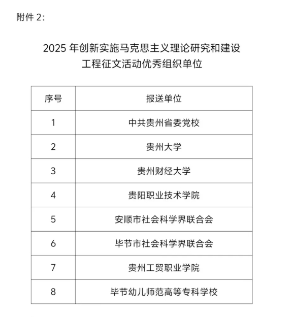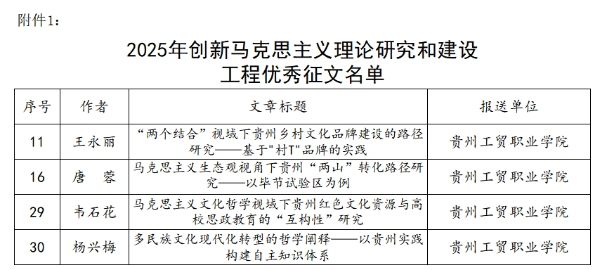 近日,贵州省社科联《2025年度创新实施马克思主义理论研究和建设工程征文结果的通知》正式公布。马克思主义学院报送的论文中有4篇论文被评为“优秀论文”,学校同时被授予“优秀组织单位”称号,实现数量与荣誉“双丰收”。