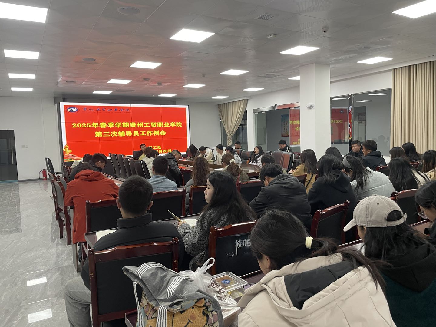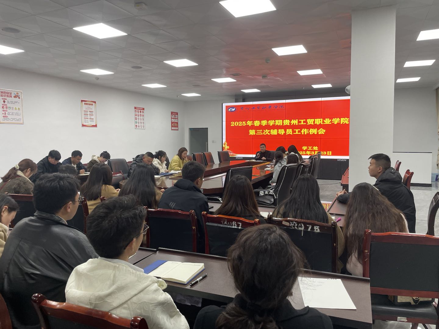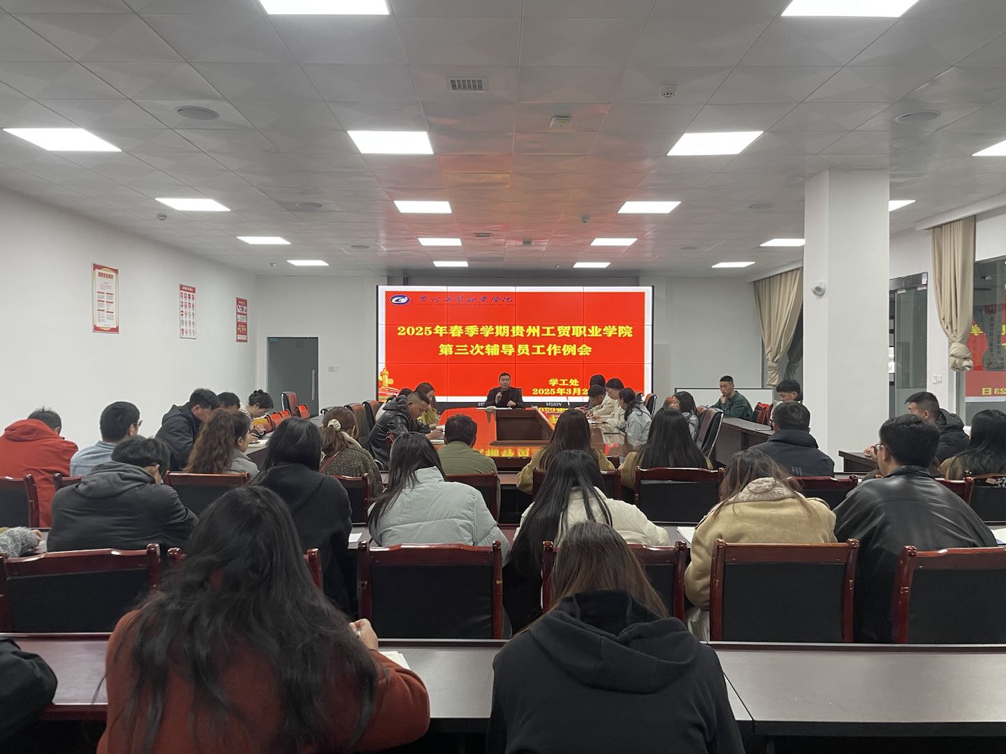 为进一步强化辅导员管理与学风建设,推进学校兵役登记工作,提升学校学工工作质量, 3 月 23 日学工处组织团学全体工作人员、全体辅导员于二教负一楼公共会议室召开本学期第三次辅导员工作例会。学工处处长庹志兴及全体辅导员参会,会议由刘佳主持。