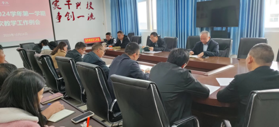 2023-2024学年度第一学期第四次教学工作例会于10月24日在综合楼三楼会议室召开,参会人员主要有校党委委员、副校长李建萍、李新发,教务处全体人员,各二级学院负责人及教务科长。本次会议由副校长李建萍主持。