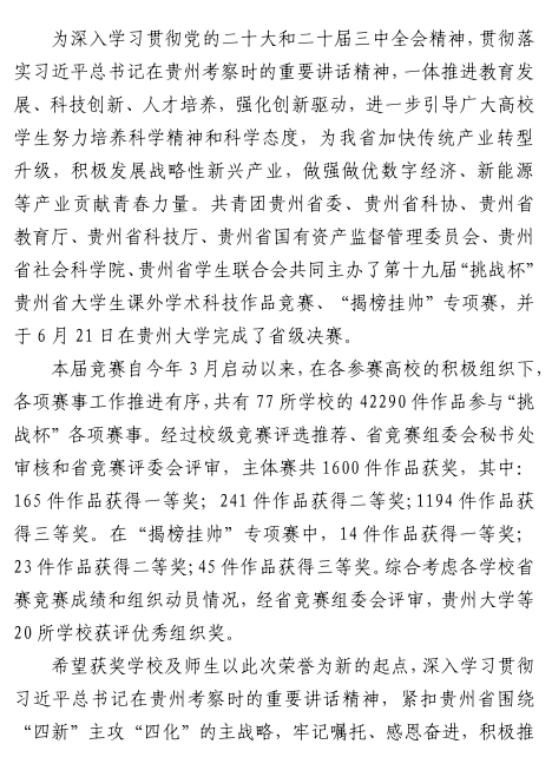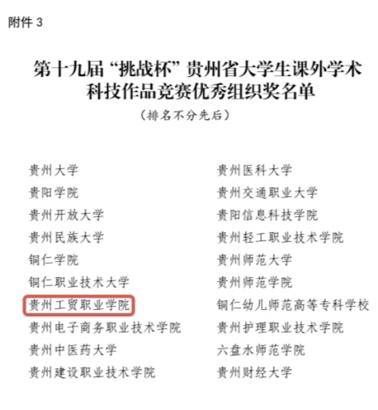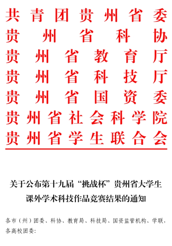 金秋传喜报,创新绽光彩!在第十九届“挑战杯”贵州省大学生课外学术科技作品竞赛中,在上级团组织的指导关心下,在全校师生的共同努力下,Ky开元不负众望的荣获“优秀组织单位”奖。