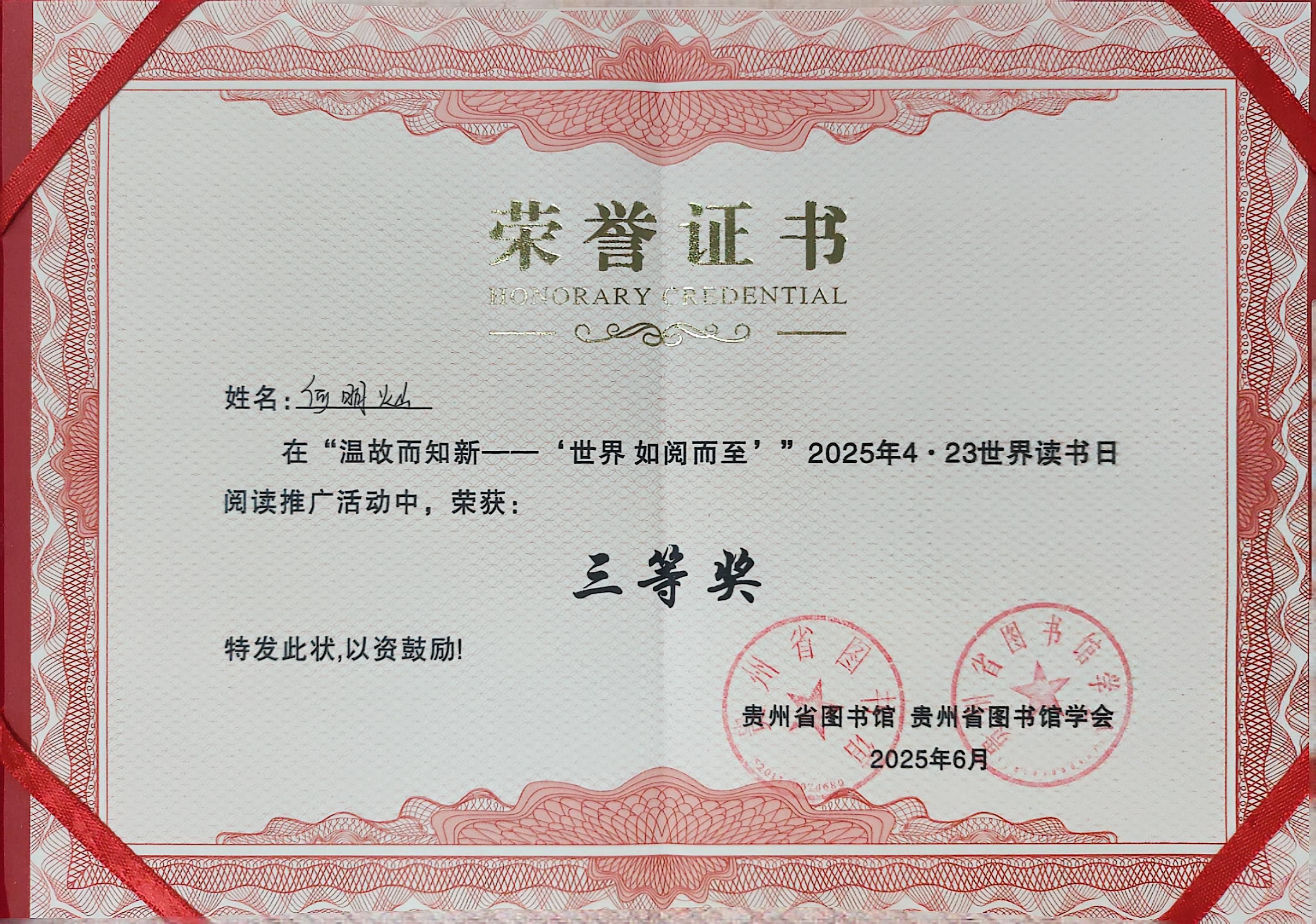 6月13日,“温故而知新—‘世界 如阅而至’”2025年阅读分享活动暨颁奖仪式在贵州省图书馆南馆二楼学术报告厅举办。此次阅读推广活动由贵州省图书馆、贵州省图书馆学会主办,旨在倡导全民阅读,营造浓厚的书香氛围,吸引了众多高校、公共图书馆积极参与。