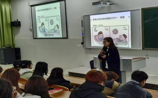 杨盼则深入阐述了影响大学生身体健康的三大“杀手”——晚睡、缺乏锻炼、饮食不规律。讲解中结合专业特色,用丰富的案例进行讲解,立意新颖,构思巧妙,发人深省,让同学们刷新了对“健康”的认识。她最后针对这三大“杀手”给出三点建议,23点前睡觉、适量运动、均衡营养饮食。呼吁同学们,不要当脆皮大学生,重视自己,规划好一切,不要让家长和辅导员焦心劳思。