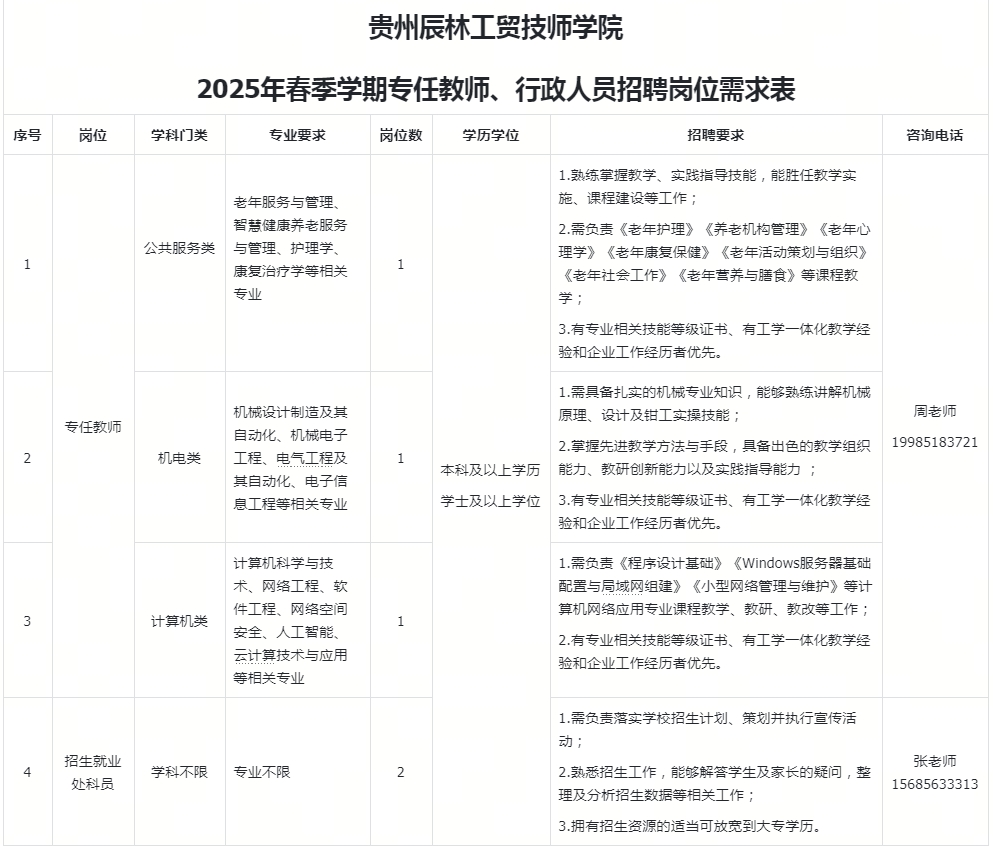 贵州辰林工贸技师学院是2022年7月经贵州省人民政府批准设立,集全日制技术技能教育、社会培训、职业技能认定为一体的技工类院校,是毕节市唯一一所技师学院。位于百鸟之都、阳光之城的草海之滨——威宁,占地面积150.16亩,校舍建筑面积近10万平方米,专业实训场地面积共计2.8万平方米。学院开设了汽车维修、计算机网络应用、老年服务与管理、服装设计与制作等专业。以定向培养、校企共建为宗旨,秉承“高端引领、校企合作、多元办学、内涵发展”的技工院校育人理念,聚焦“岗、课、赛、证”综合育人体系,采用校中企、企中校的工学一体化教学模式组织教学,让理论教学与实践教学、专业学习与工作岗位、能力培养与岗位标准相对接,全面提升学生的综合职业能力。让学生成为新时代企业需求的技术技能型人才,让学校成为社会满意、企业认可的、家长放心的优质学校!