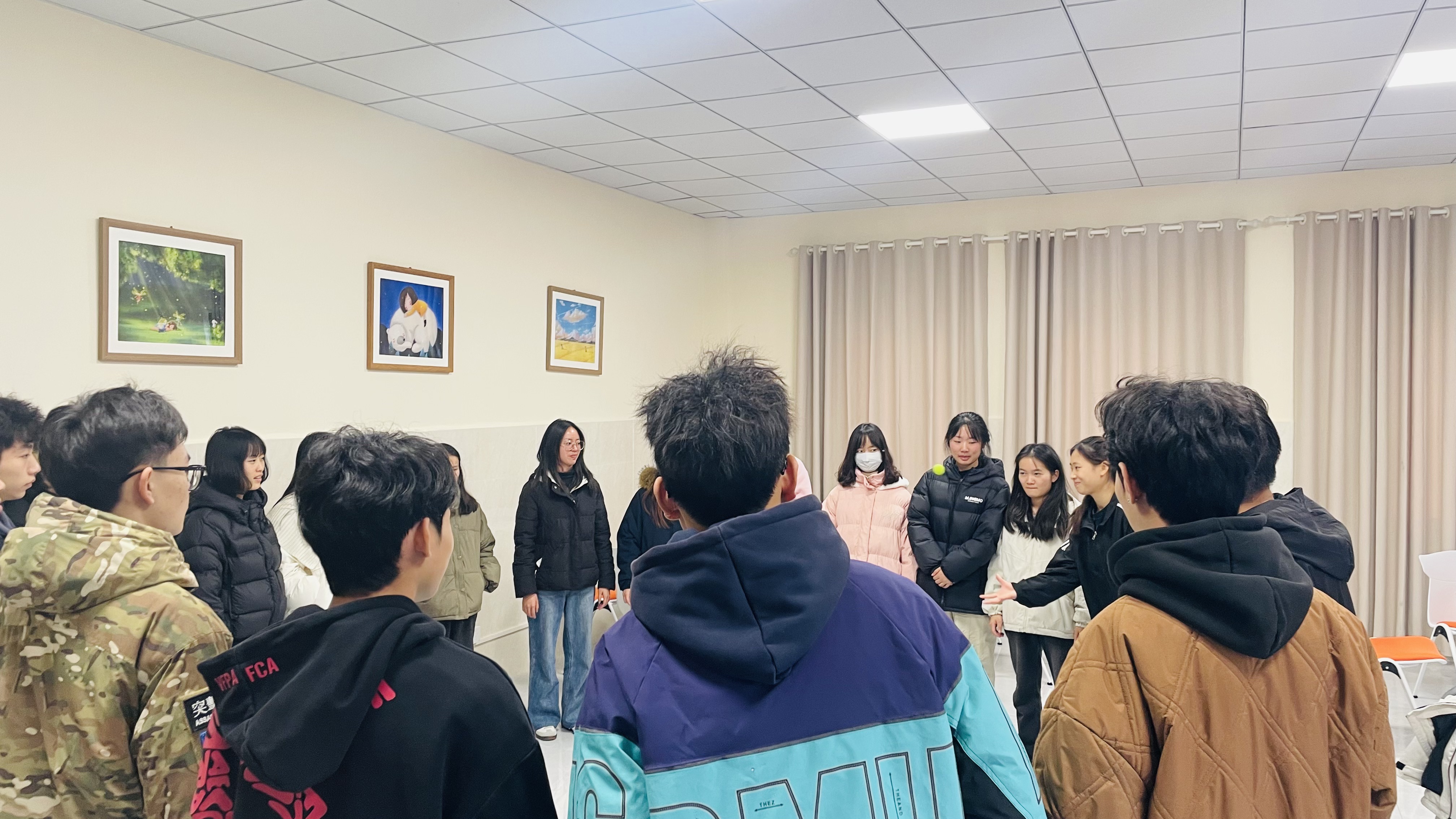 活动在轻松活泼的“抛物唱名”游戏中拉开序幕。同学们围圈而立,伴随着网球在空中划出的一道道弧线,一个个熟悉或陌生的名字被响亮唤起。游戏不仅快速消除了成员间的陌生感,更在欢声笑语中让大家加深了对彼此的印象,为后续活动营造了开放、信任的团体氛围。