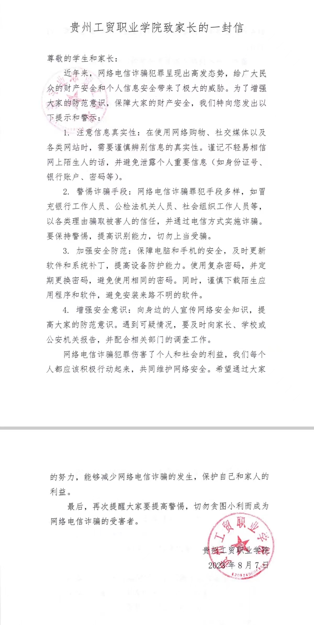 工贸职业学院致学生家长的一封信