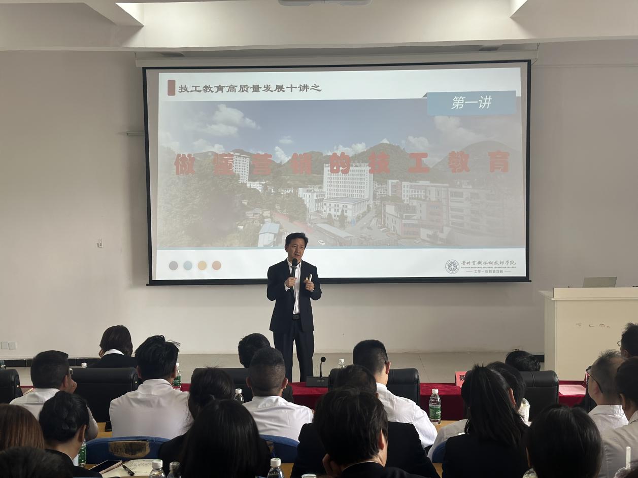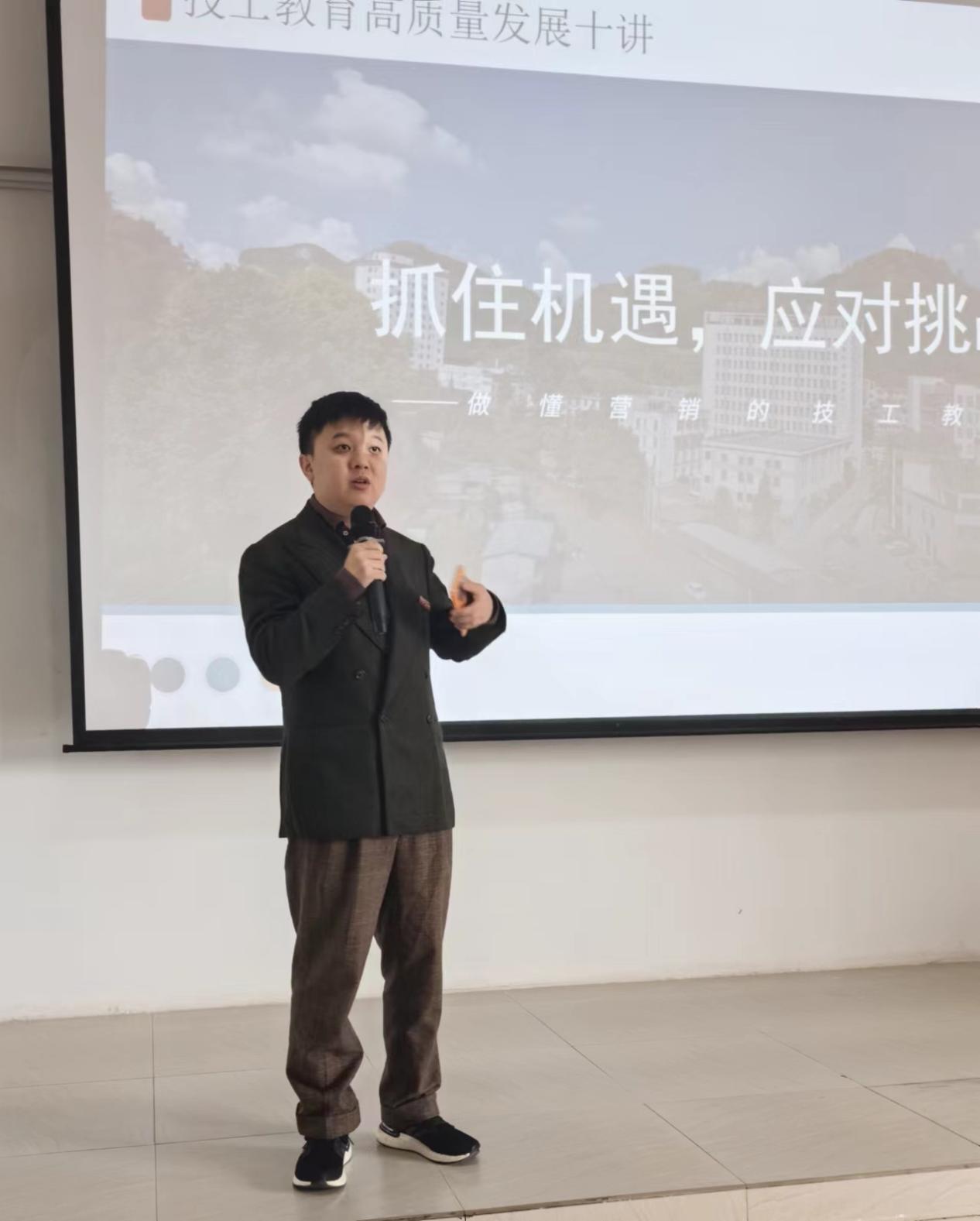 刘毅就如何落实教研联盟工作、班主任论坛及招生联动做了安排和布置,并强调两校在工作中第一要强调共同价值观。尽管两校都有其独特的教学理念、专业特色和优势,但在招生联动中,必须强调共同的价值观和教育目标;第二要突出各自的优势。在招生联动活动中,要展示两校独特的教学资源和优势;第三要共同制定宣传策略。在招生联动中,两校可以共同制定宣传策略,确保宣传内容既体现共同的教育理念和目标,又突出两校的特色,找到最佳的平衡点;第四要提供多样化的选择。在招生过程中,可以提供多样化的专业和课程选择,以满足不同学生的兴趣和需求。这样,既可以突出两校的特色,又可以为学生提供更广泛的选择,锁定学生在两校间做选择;第五要加强交流与合作。除了招生联动外,两校还可以加强在日常教学、师资培训、实习就业等方面的交流与合作。这有助于促进两校之间的资源共享和优势互补,进一步提升技工教育的整体水平和品牌影响力。汤哲以技工教育高质量发展十讲之——“做懂营销的技工教育”为主题对参加本次启动仪式的教职工作了专题培训。他结合案例和数据从“技工院校毕业生数量和专业分布情况”“技工院校高质量就业趋势”“技工院校的优势”“普通高等教育毕业生情况”“技工教育思维的营销思维”五个方面为技工教育的招生和发展提出了应对的方法和策略。他强调,职业教育要持续深化改革,提出了新质生产力下职业教育如何赋能的思考?一要系统性升级人才培养目标,二要深度优化专业布局结构,三要根本性变革教育教学模式。