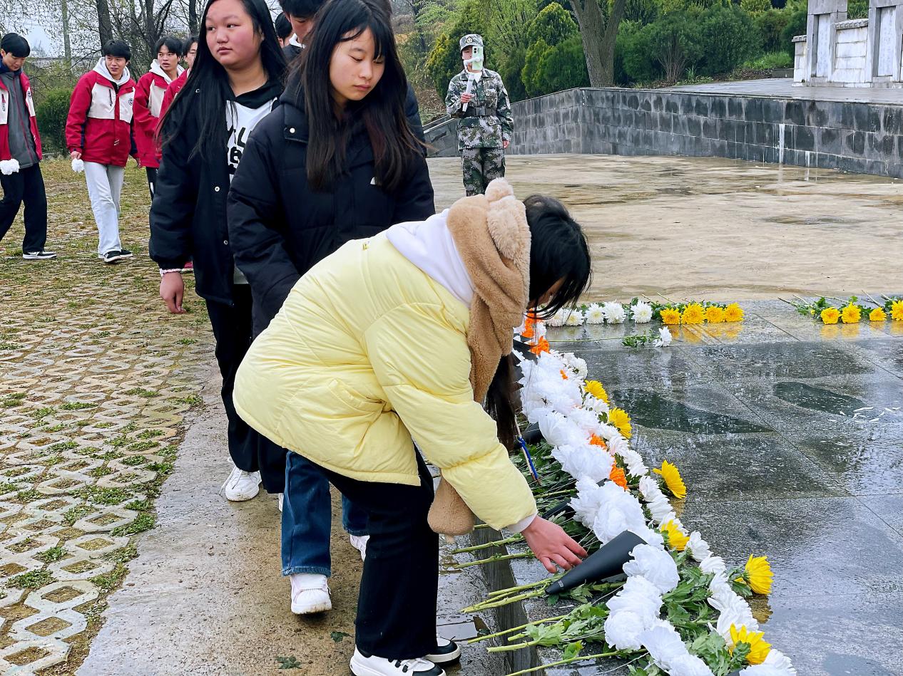 默哀结束后,师生们手持自制白色纸花,依次缓步走向烈士纪念碑,向英烈敬献鲜花并鞠躬致敬。这些白花由同学们亲手制作,既体现了环保理念,更饱含对先烈的真挚情感。由学生团队精心制作的花圈摆放在纪念碑前,花圈挽联上"革命精神永垂不朽"的字样格外醒目。师生们还环绕纪念碑瞻仰,认真阅读碑文,感悟革命先辈的丰功伟绩。