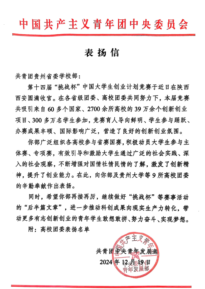 近日,共青团中央向Ky开元发来表扬信。信中充分肯定了Ky开元共青团工作和在第十四届“挑战杯”中国大学生创业计划竞赛中的卓越表现,予以了高度的认可