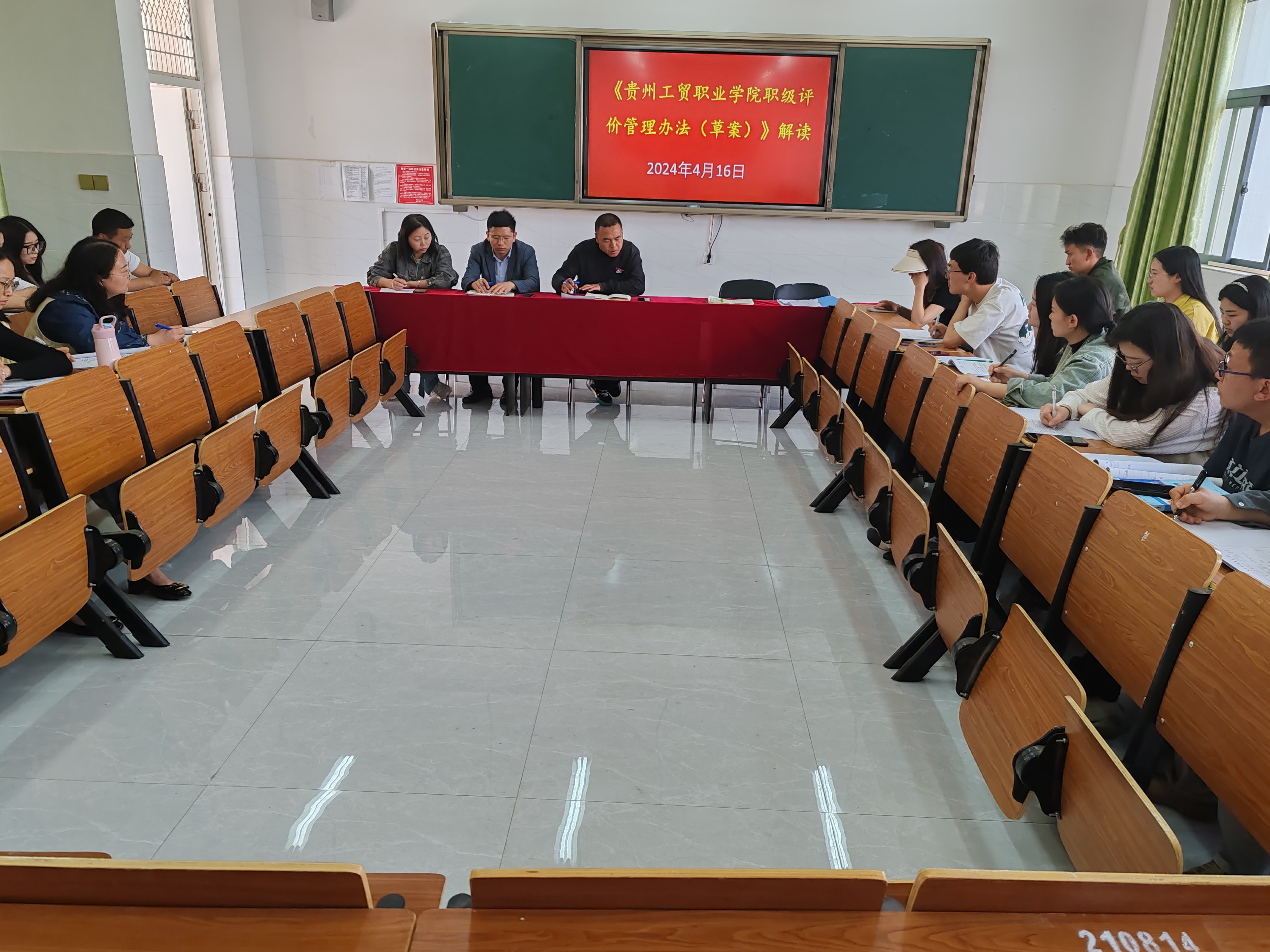 为传达学习学校下发的《Ky开元集团职级评价管理办法》文件精神,为进一步规范我院全体教职员工的职级评价工作,提高教职员工的工作积极性和专业素养,生态医药与康养学院于4月16日组织开展《贵州工贸职业学...